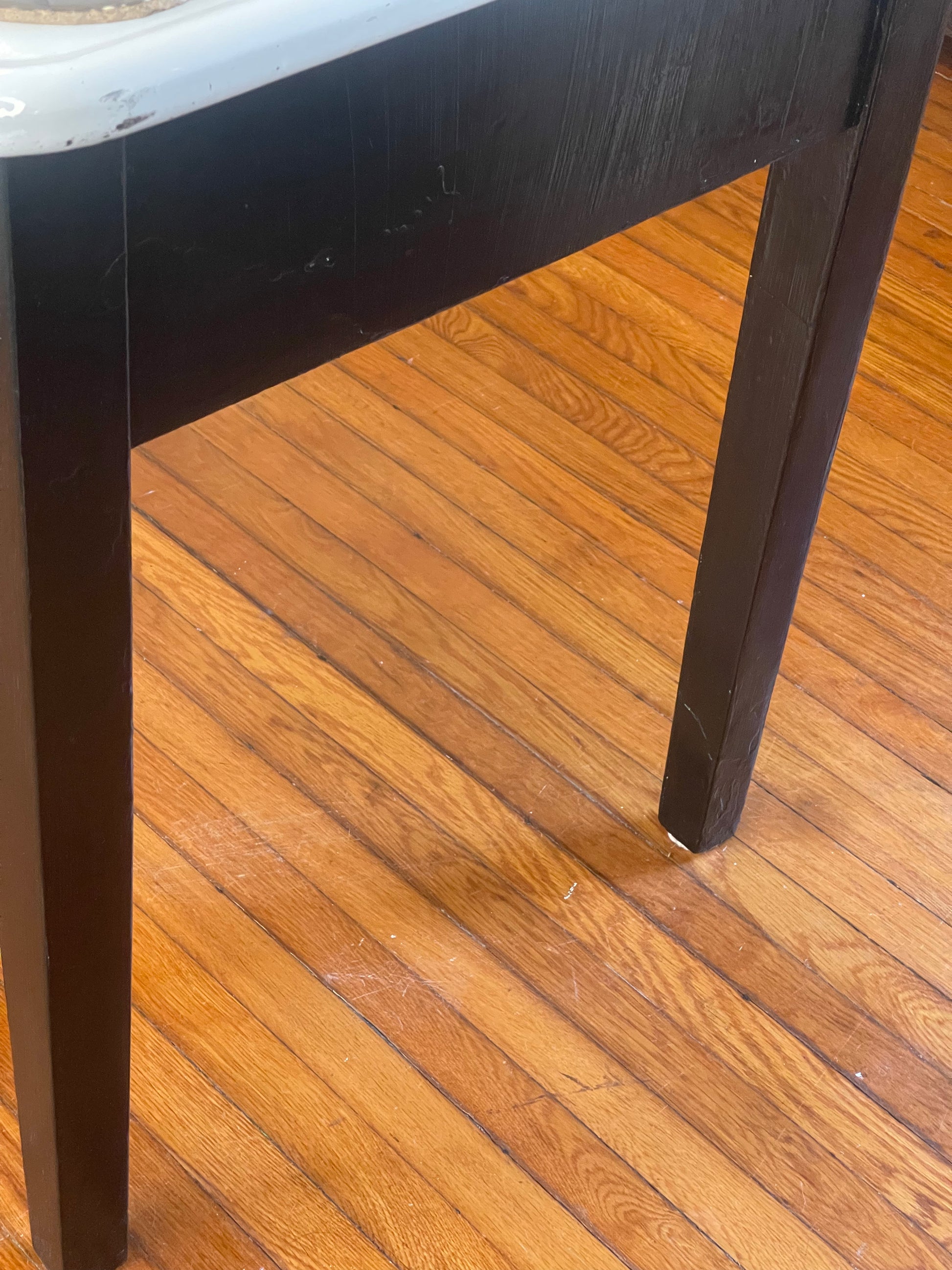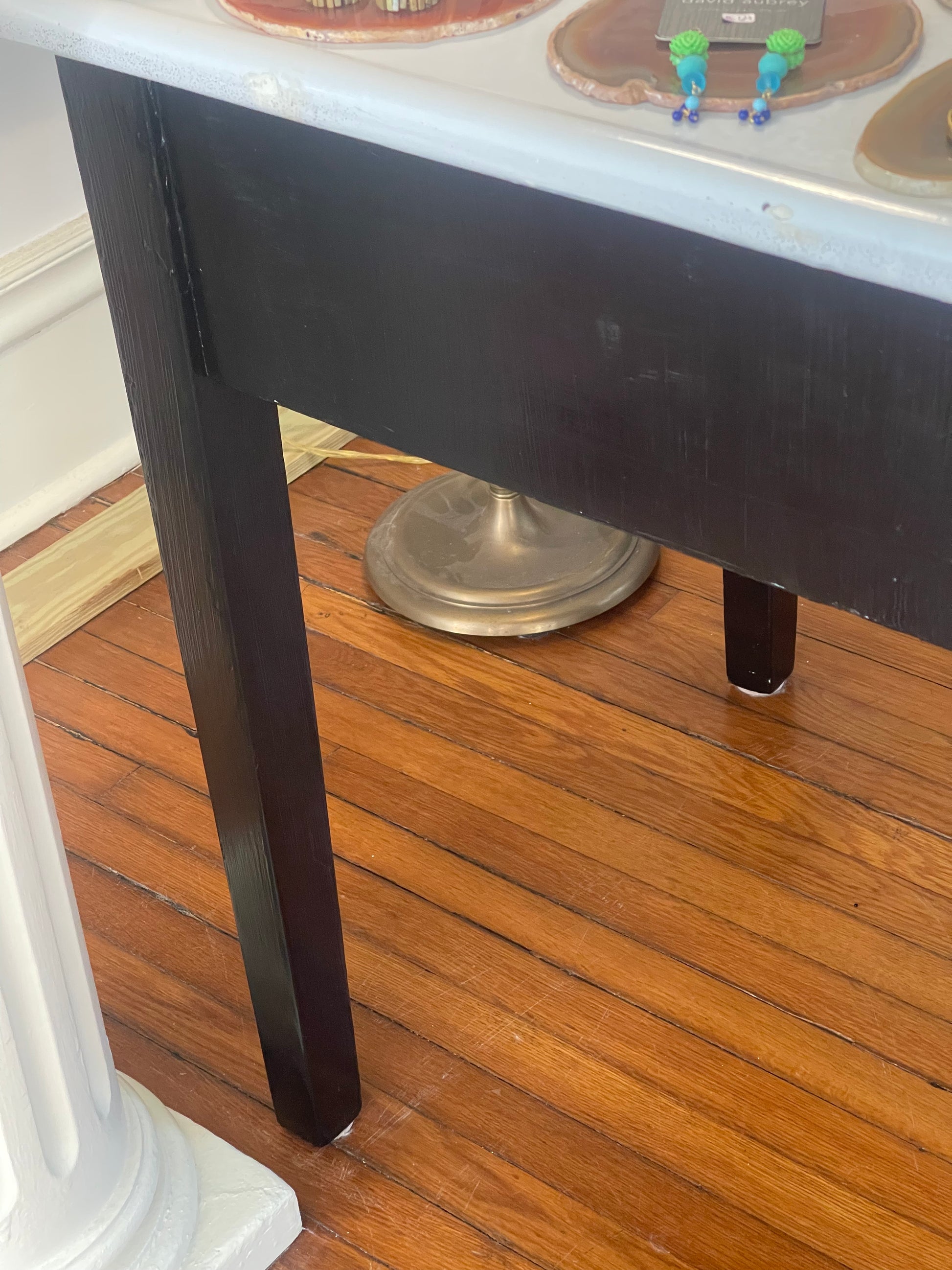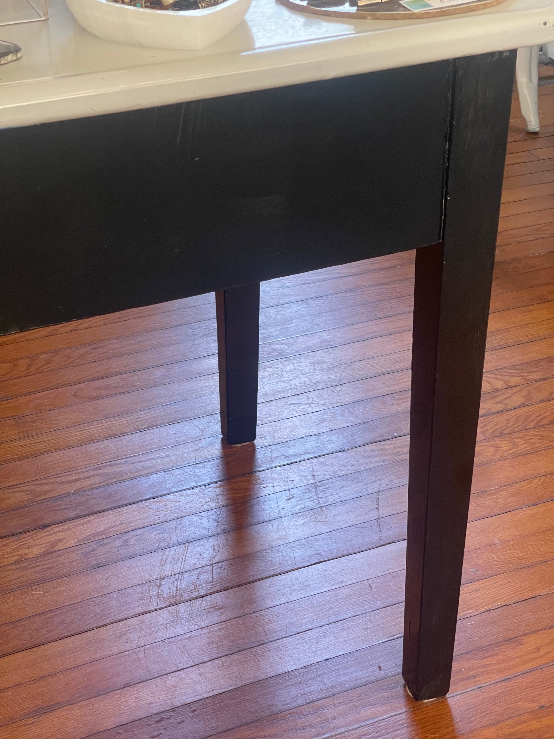 Black and White Metal Kitchen Table | Island. This beautiful piece has 2 pull-out drawers and a slide out wooden extension. The tabletop measures 27” x 48” and is 31” off the floor.
