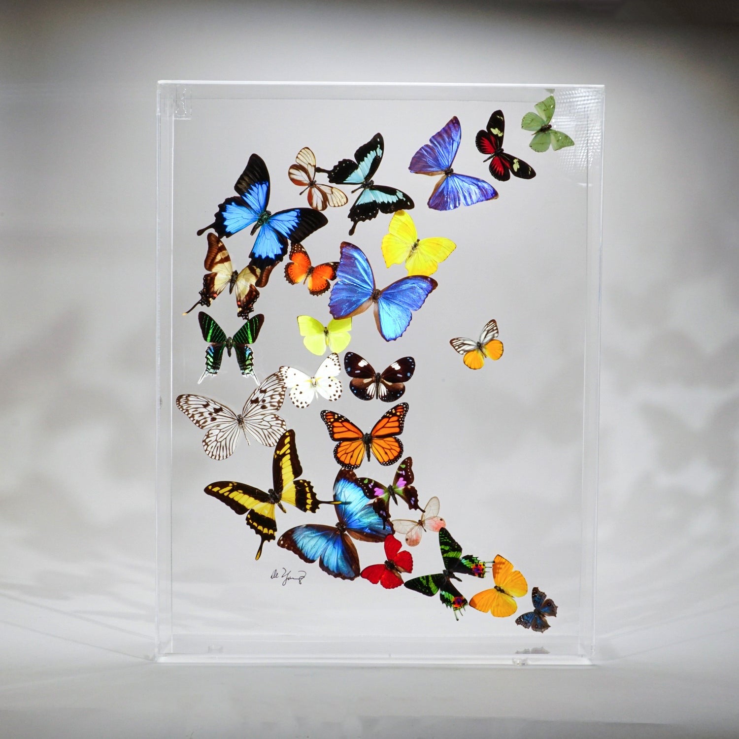 This incredible display includes a variety of species for a total of 25 genuine Peruvian butterflies. The frame includes a keyhole hook at the top for mounting the display on a wall. The butterflies in these frames are raised on butterfly farms in Peru. These butterflies are not killed for display. After the butterflies have lived their lifespan, they are then collected and put into these frames. In doing this, the butterflies can fully mature and also reproduce on the butterfly farms free of natural predators. No endangered species are used in these frames.