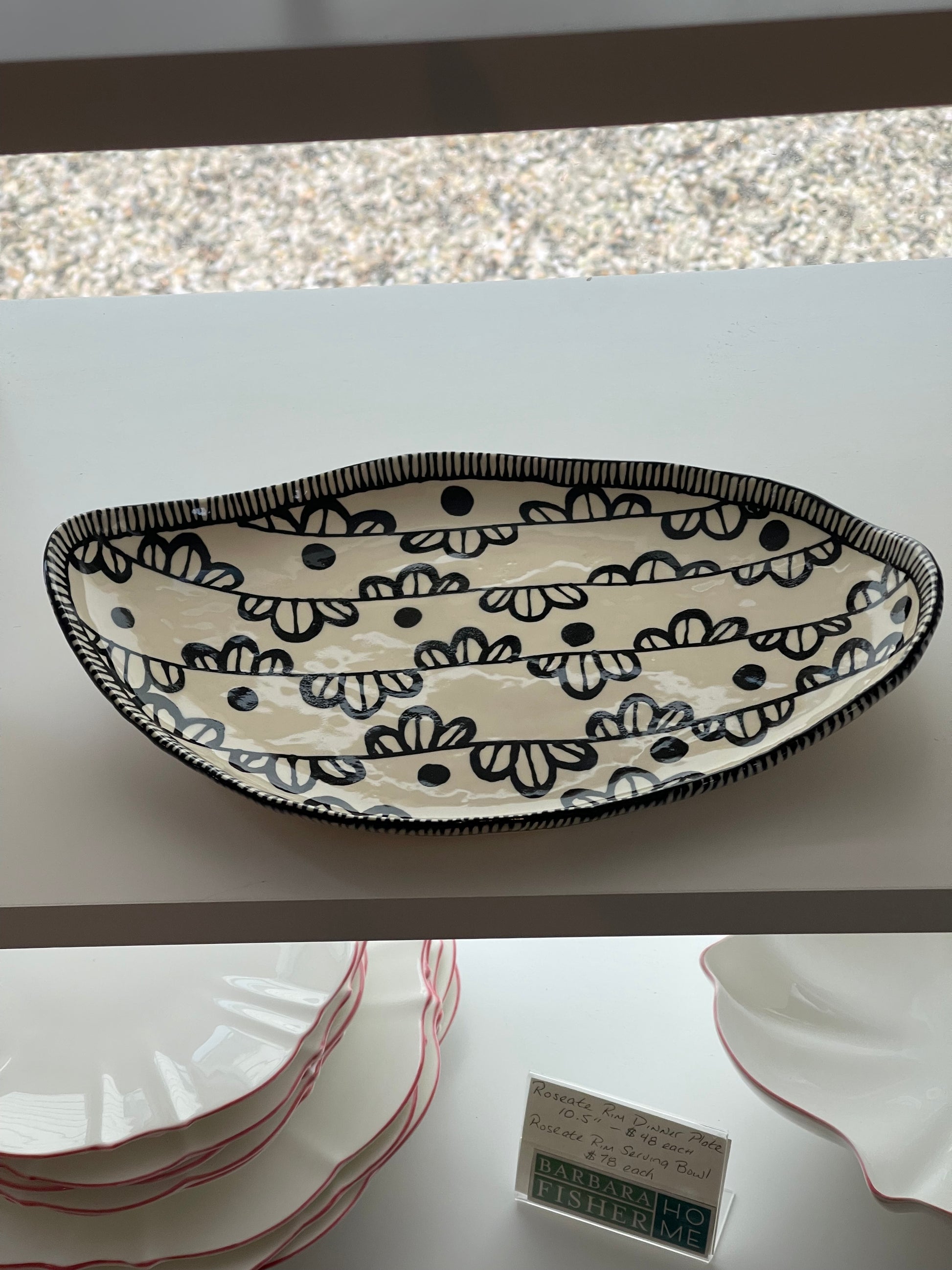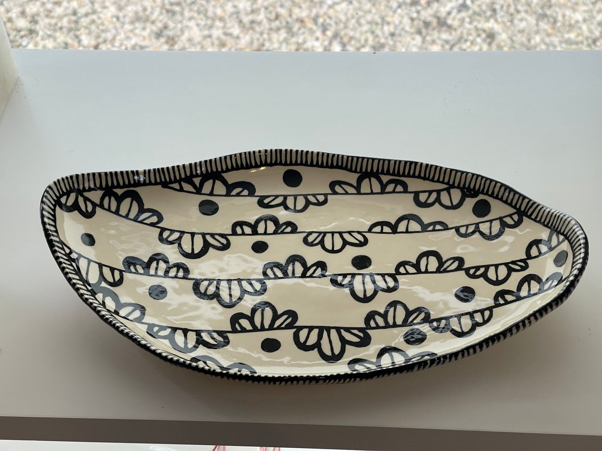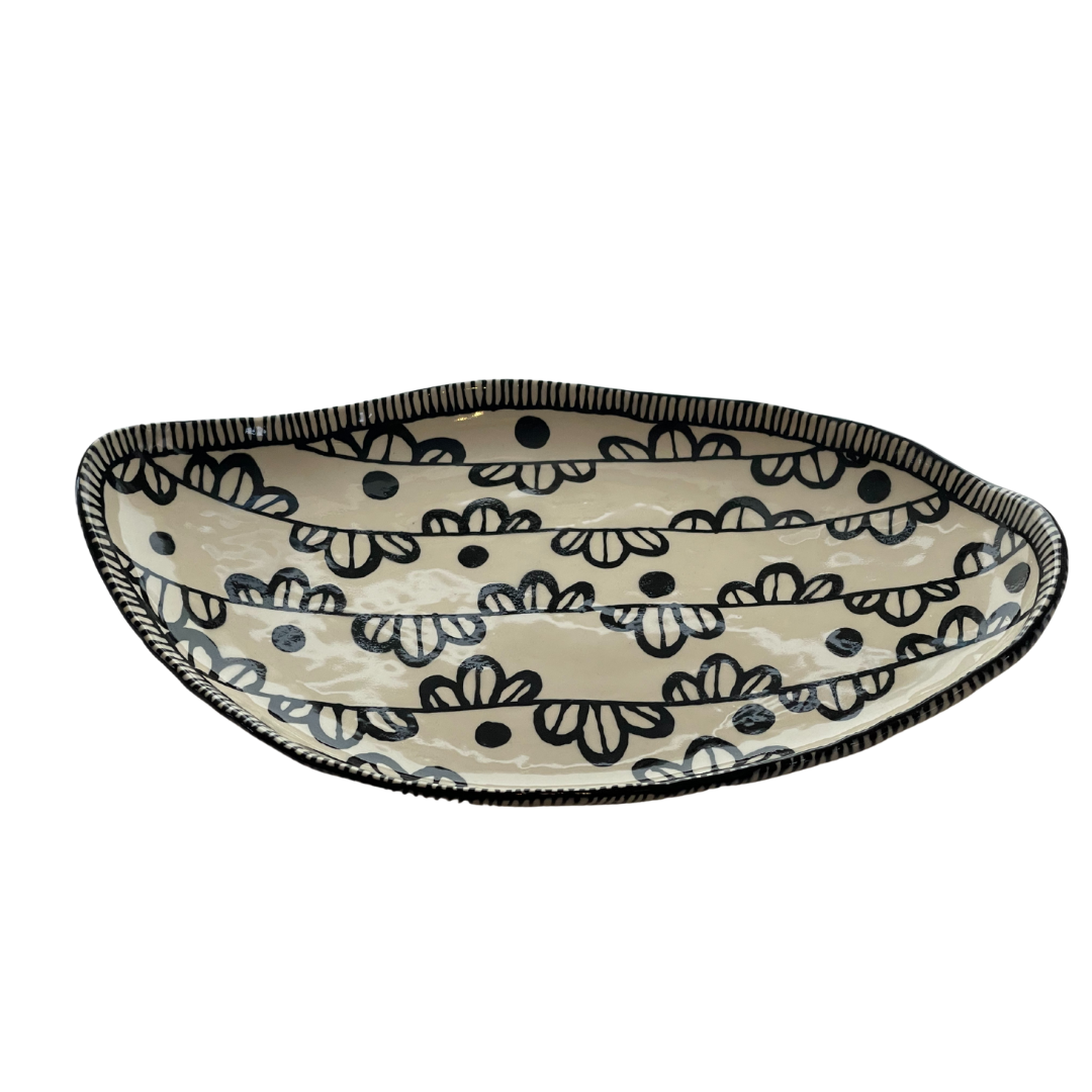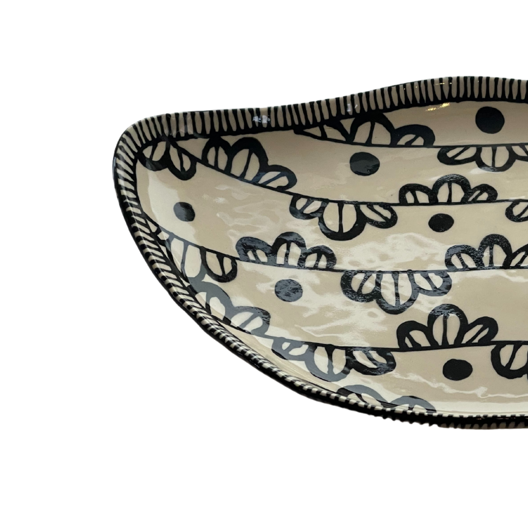 Handmade Black Freeform Pottery Dish with black design around the rim