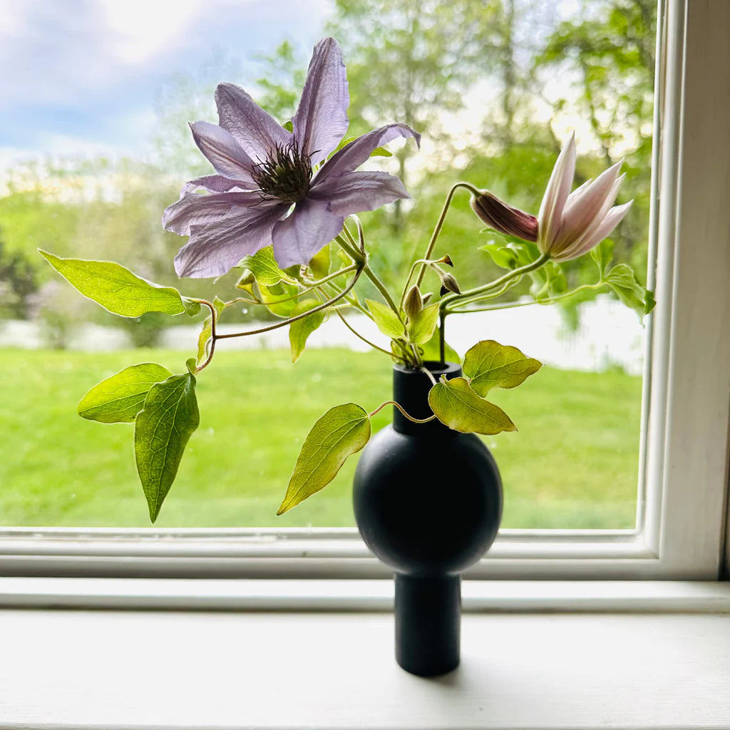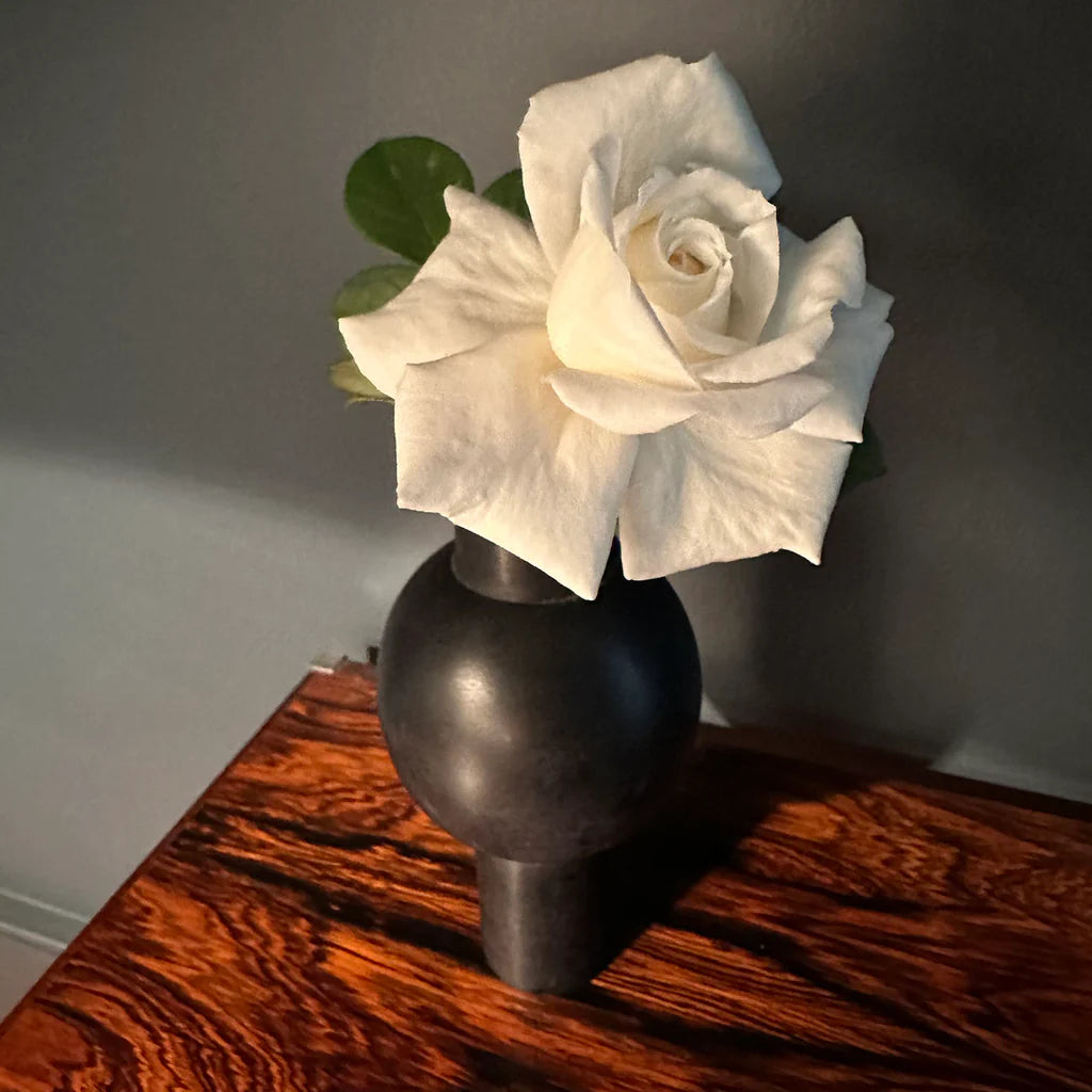 Smooth, rich soapstone; normally a grey veined, non-porous stone (that means it's water-tight), ours has been hand carved by master artisans in Agra, stained black and given a waxed finish. Feels good in your hands and looks stunning by itself or holding a few blooms. The base is weighted with solid stone. Natural variations and veining are evident in each unique piece.