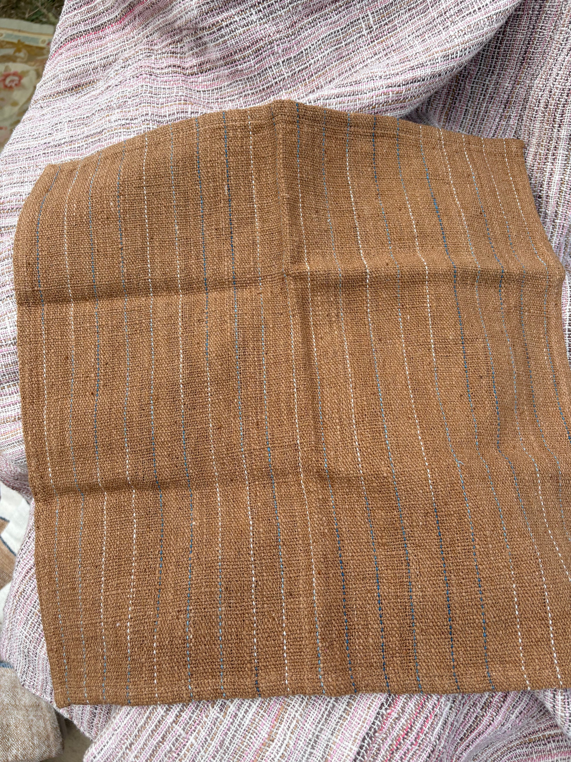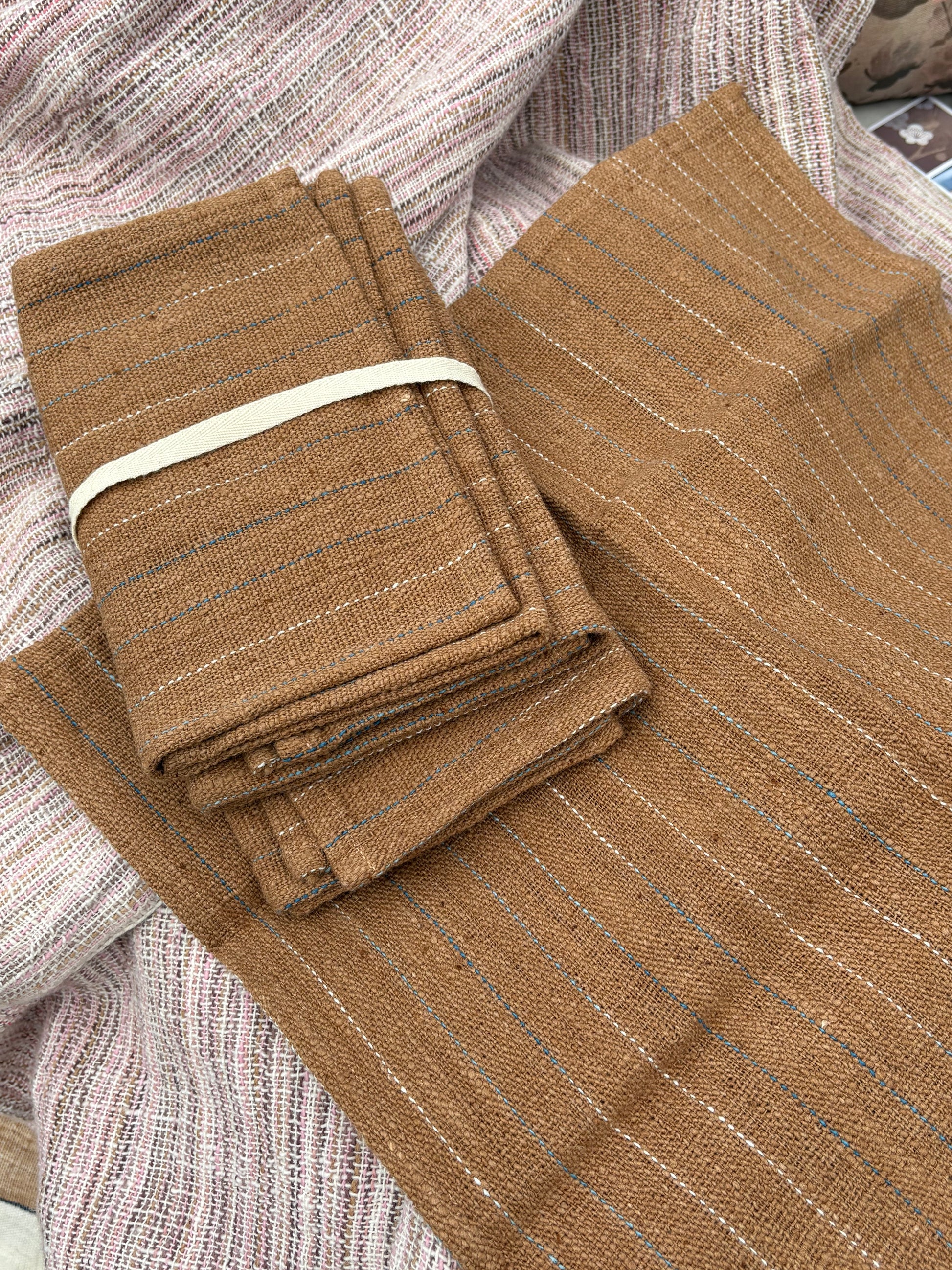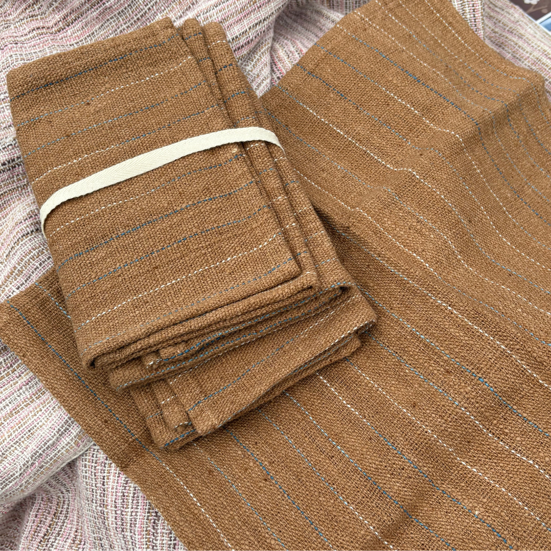 A beautiful two-layer handwoven brown cotton napkin. The two layers of cotton are joined by hand with a delicate running stitch. Naturally-grown cotton and botanical dyes. Sold in sets of 4.