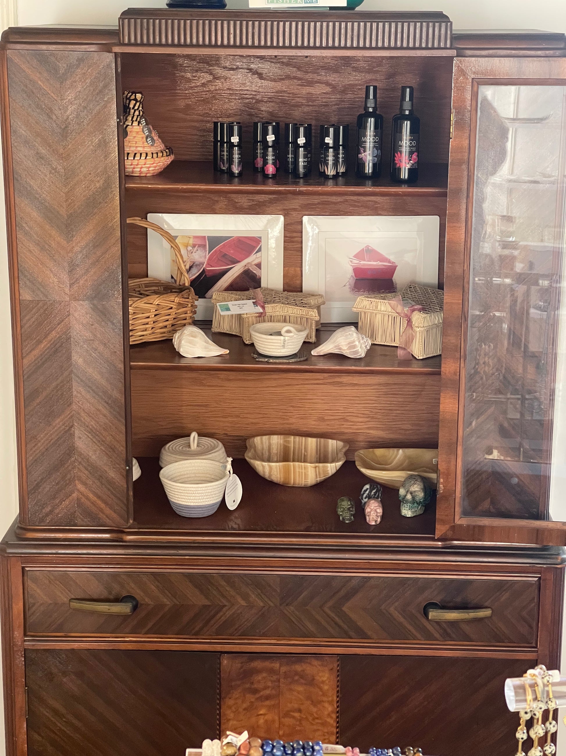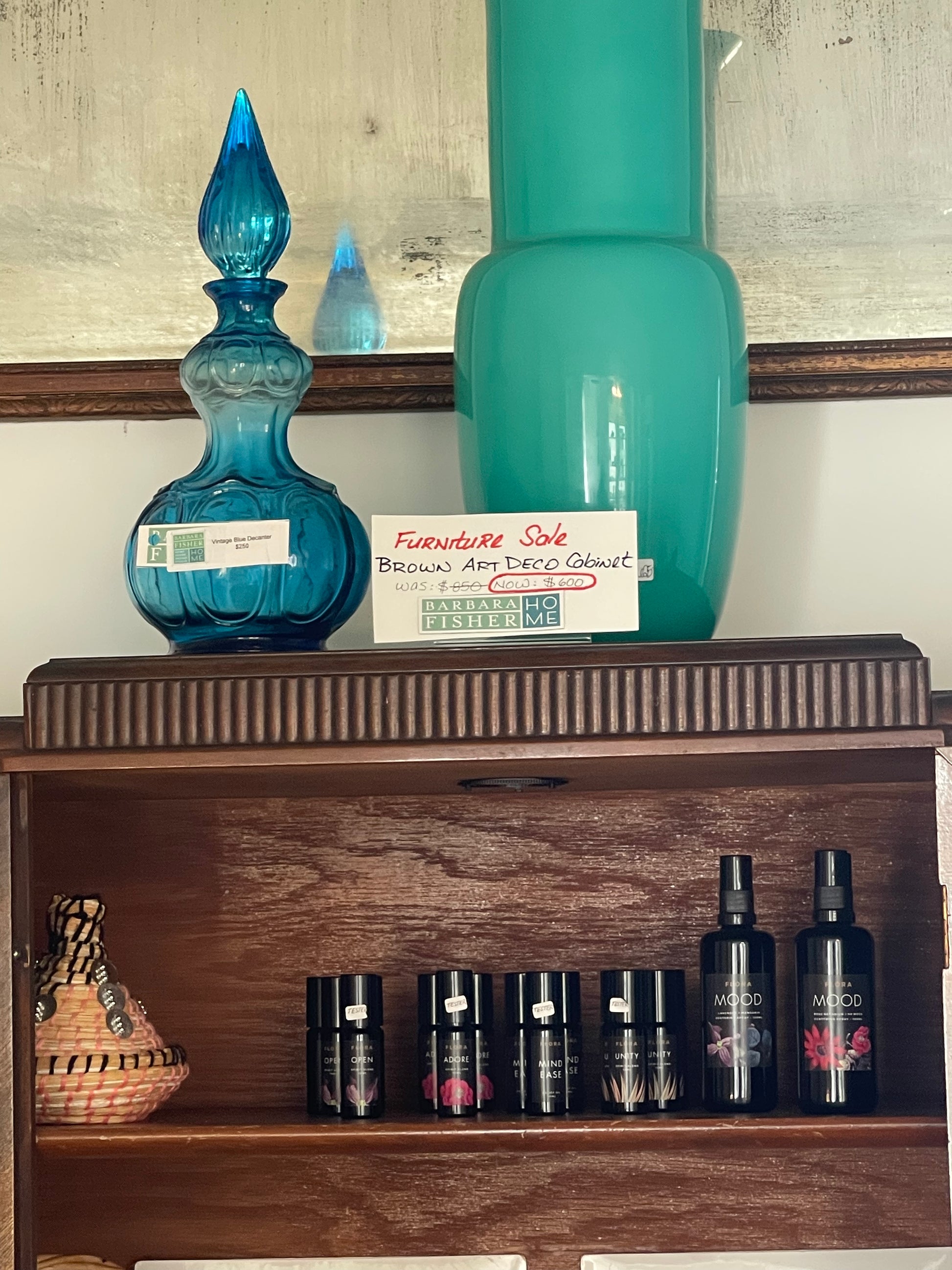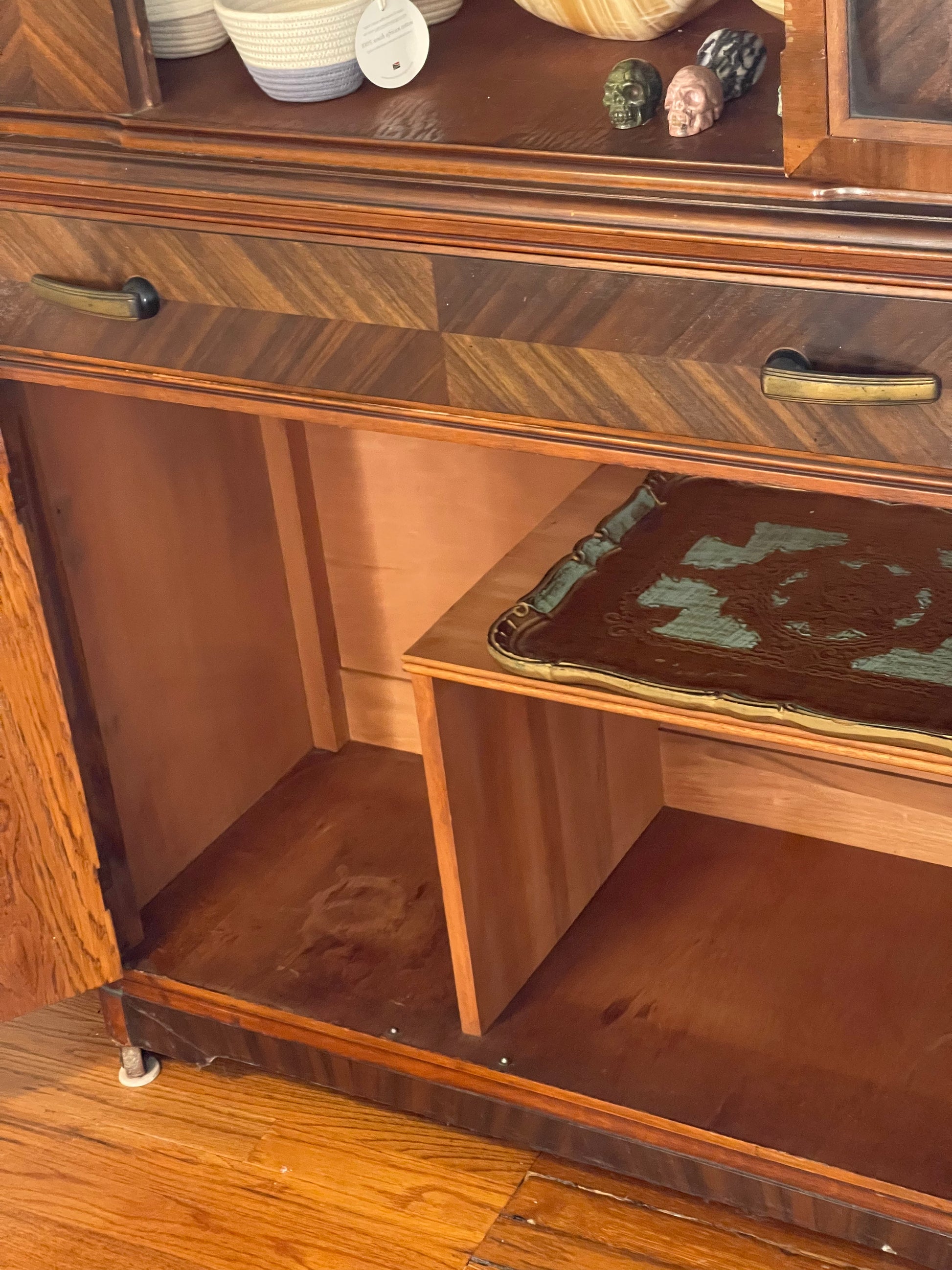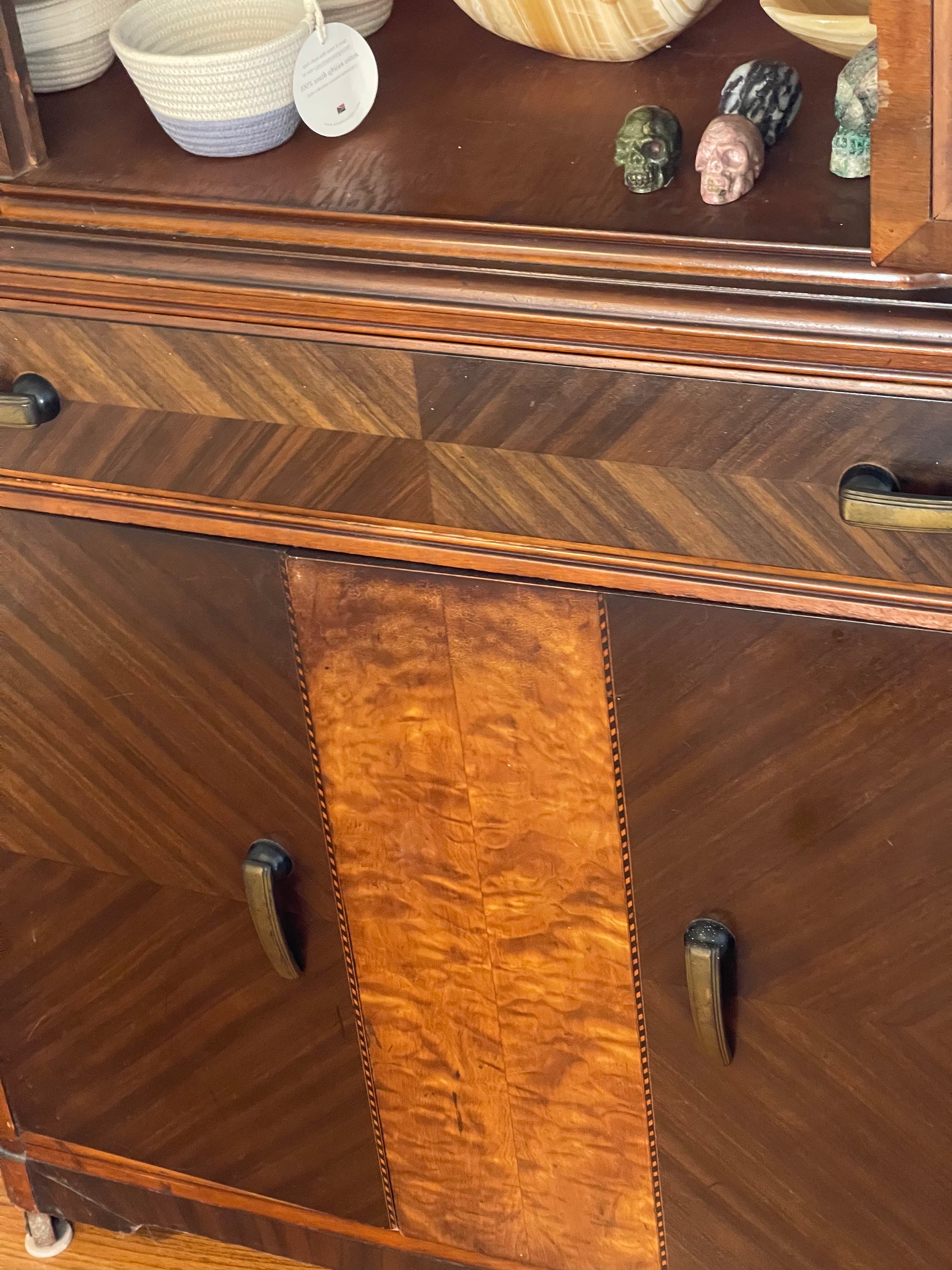 This brown art-deco cabinet has a glass door in front of 3 inlaid shelves. It has one drawer and 2 doors at the base. This original piece has no repairs and is on wheels.