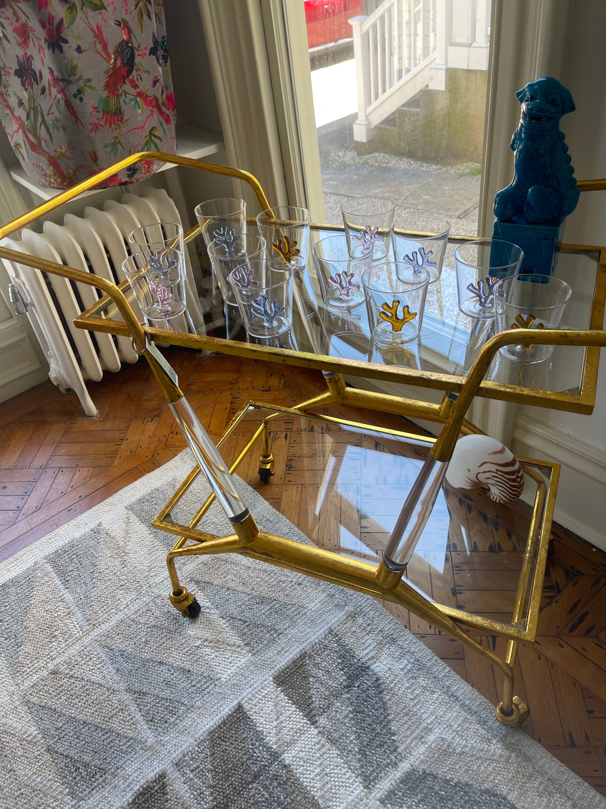French Modern Bar Cart in Gold Brilliant Gold Leafed Steel with Glass Inserts and Acrylic Pillars.