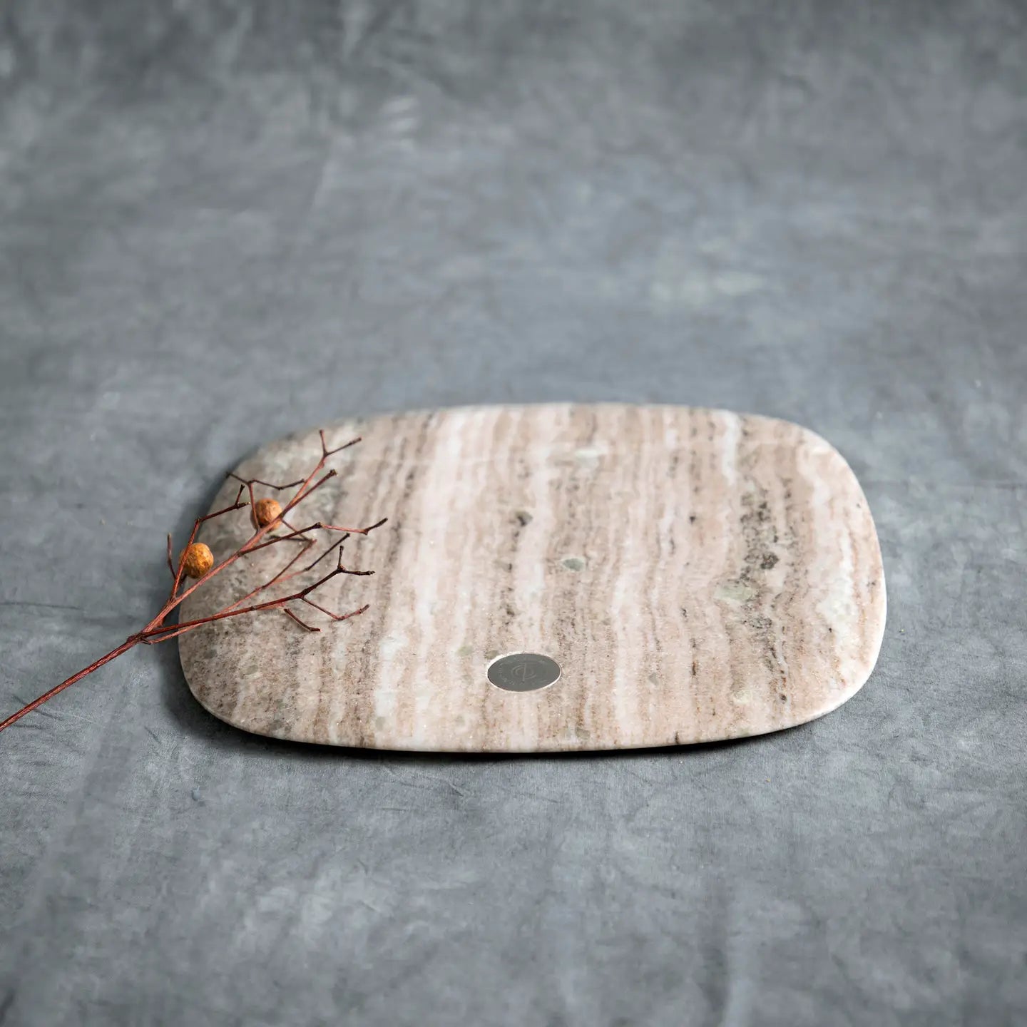 Skilled artisans craft each marble board by hand, shaping it with beveled edges and a smooth top and adding our logo medallion as a finishing touch. The natural material displays thin bands of gray and white within, guaranteeing no two boards look exactly alike. This softly rounded serving piece is roomy enough to fit a cheese assortment and rows of artisanal crackers along with serving utensils.