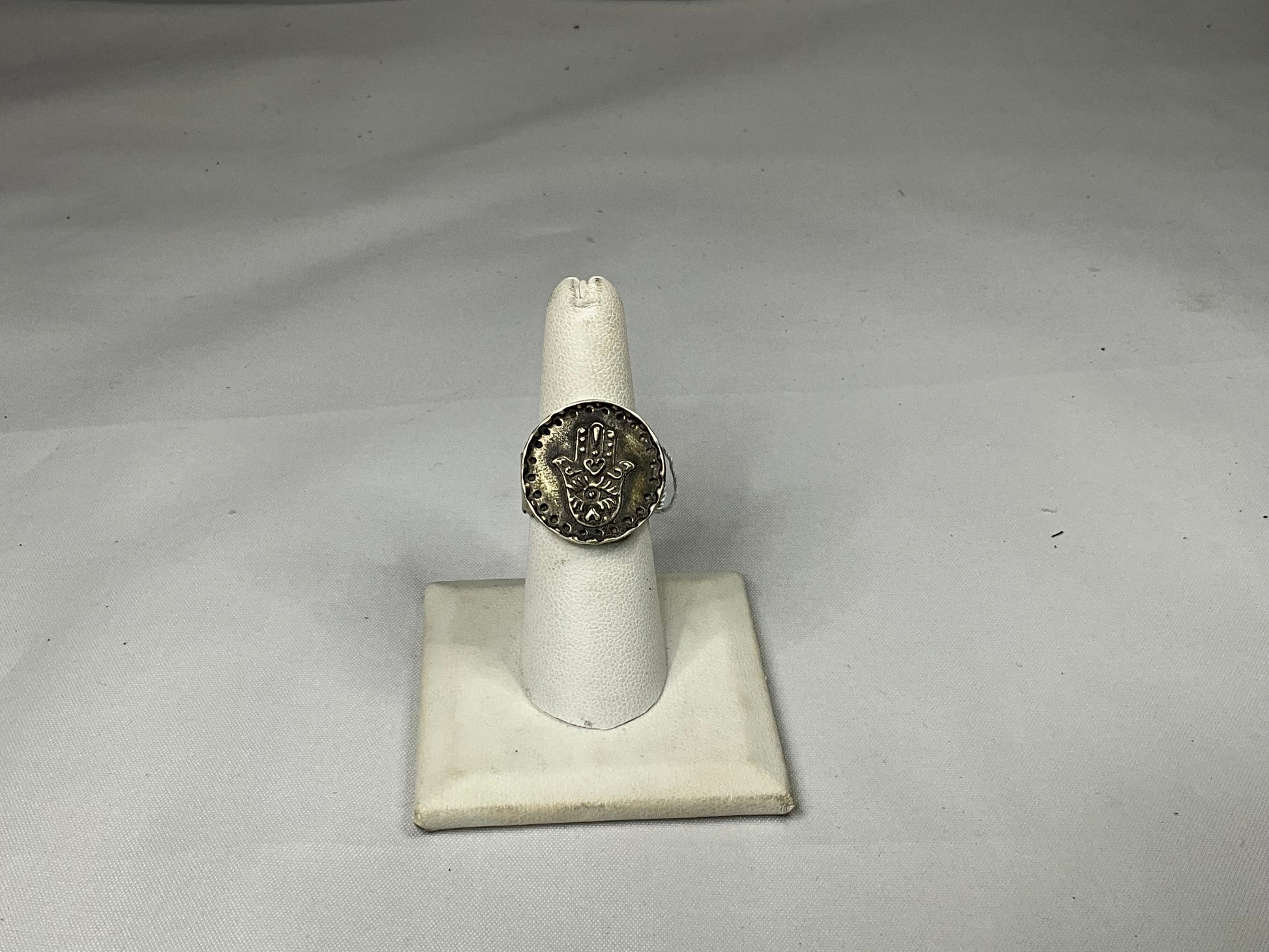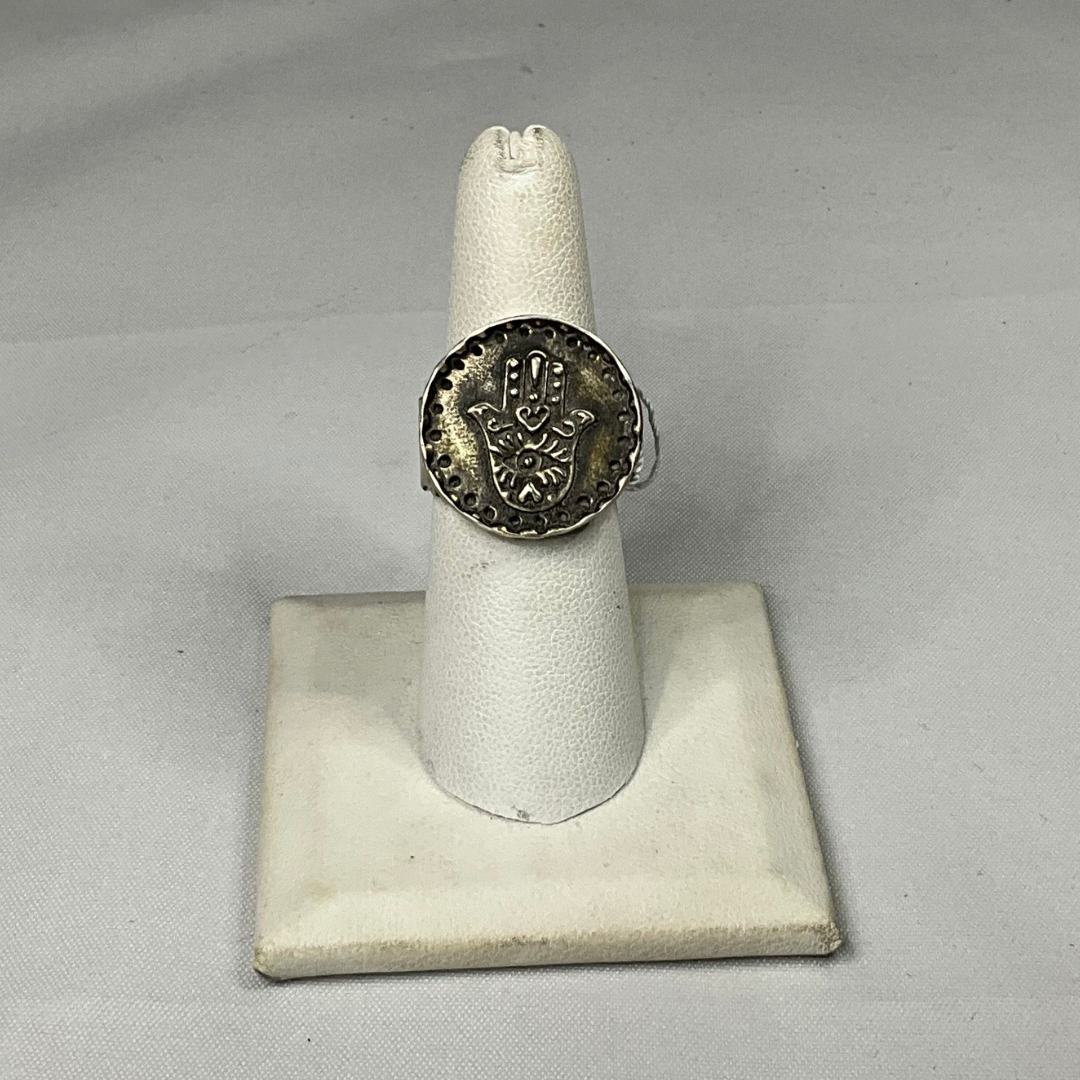 This handmade round ring has a detailed Hamsa shape engraved on the front.