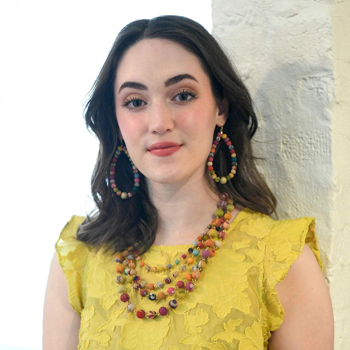 A shimmering gold bead embellishes the center of these colorful, statement-making hoops. Finished with nickel and lead-free ear wires. Very lightweight! Handmade from recycled Kantha textiles, so colors and patterns will vary.