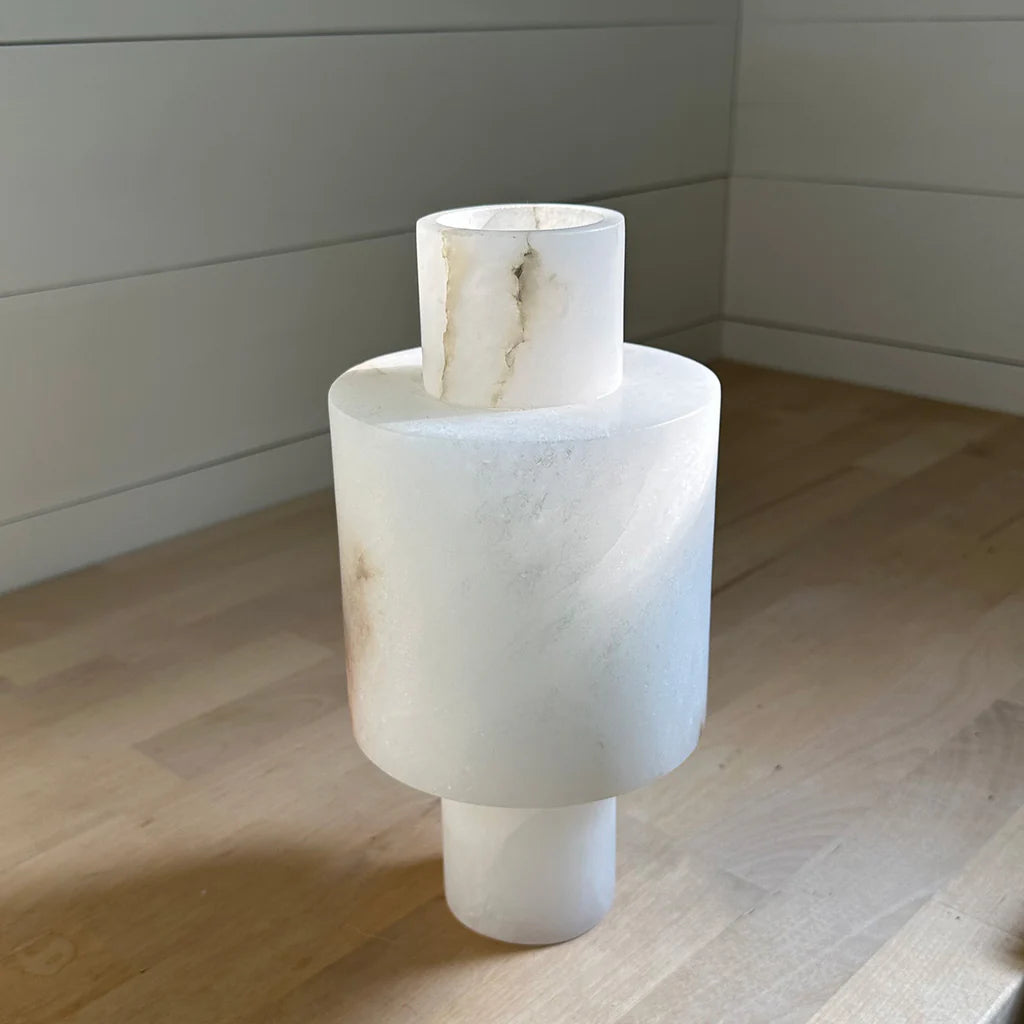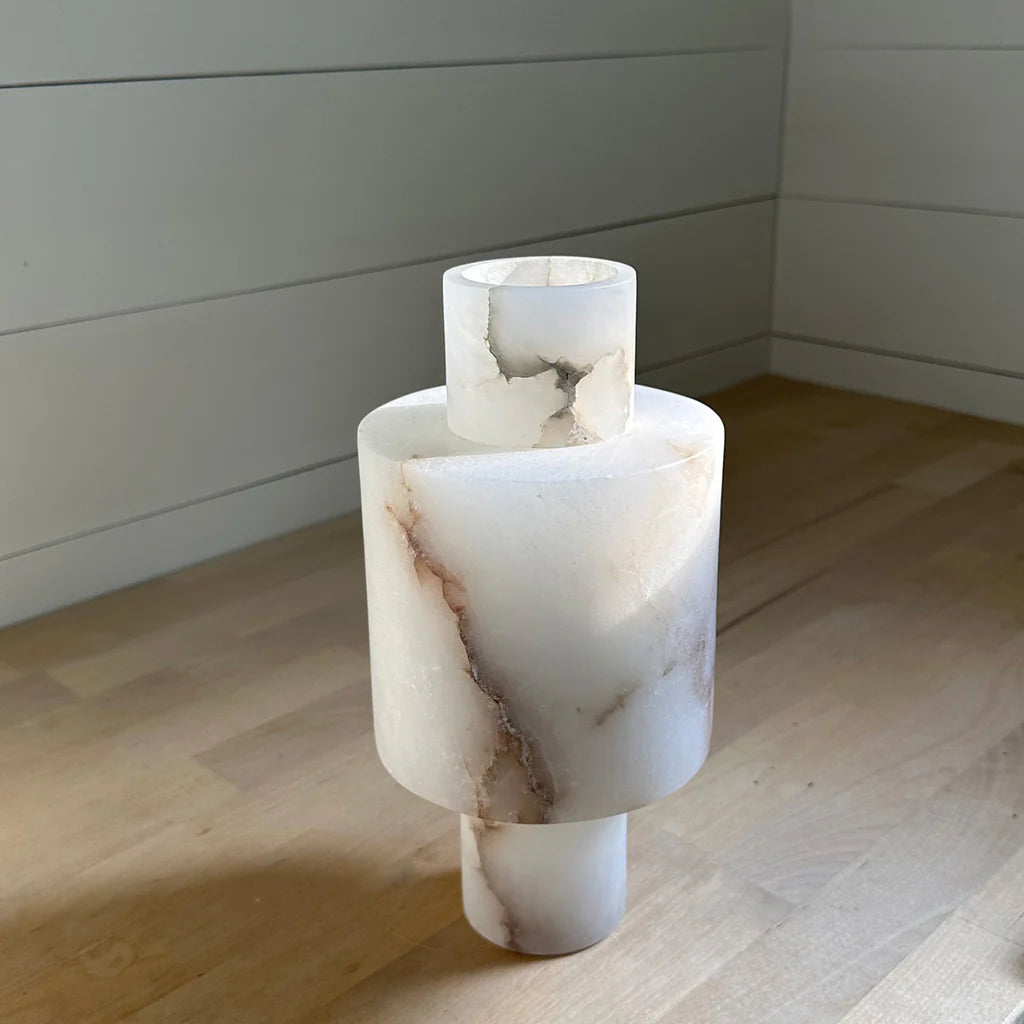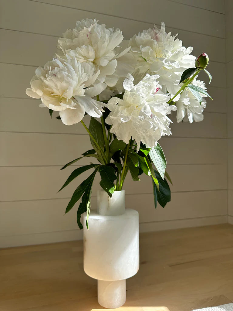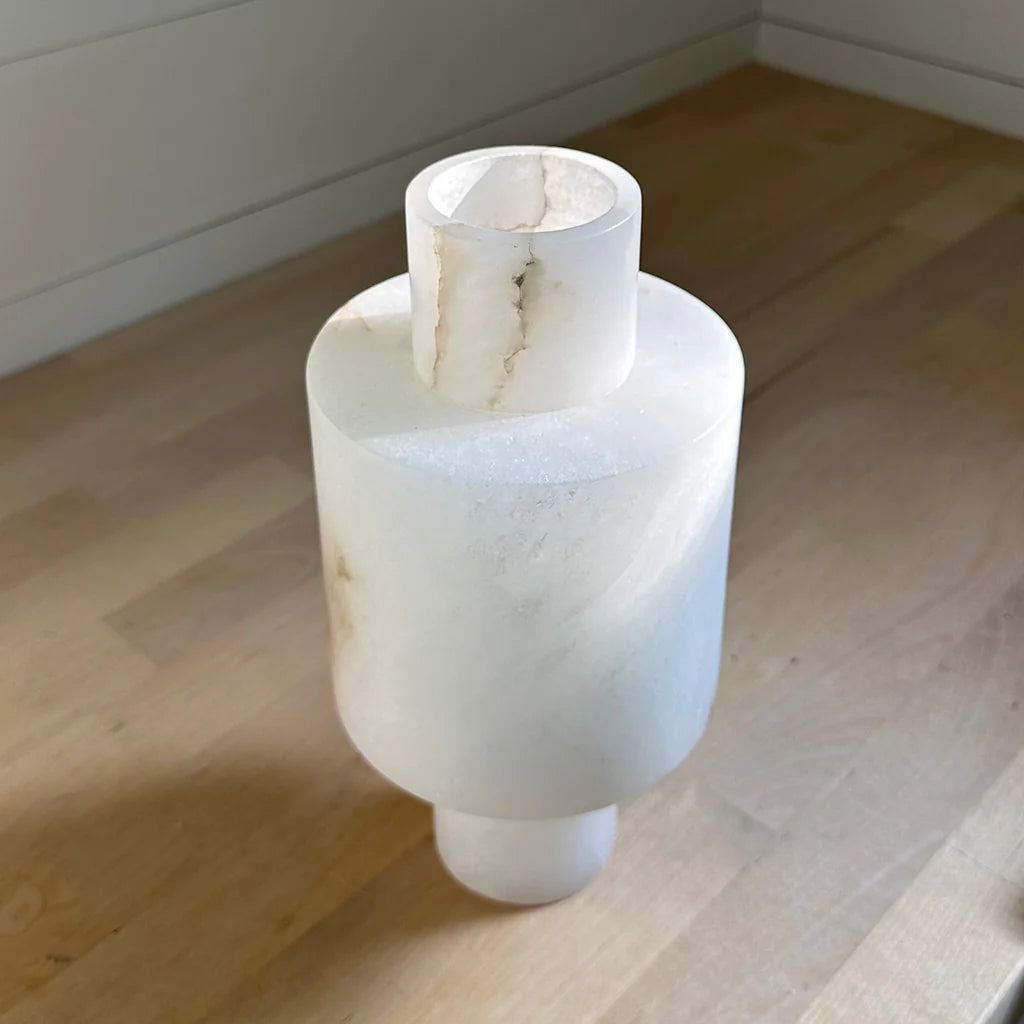 This is a one-of-a-kind vase that we named Maxine. Made out of beautiful alabaster and comes with a slim clear glass insert to guarantee that it will be water-tight and keep your stone clean. The photos show the exact piece for sale.