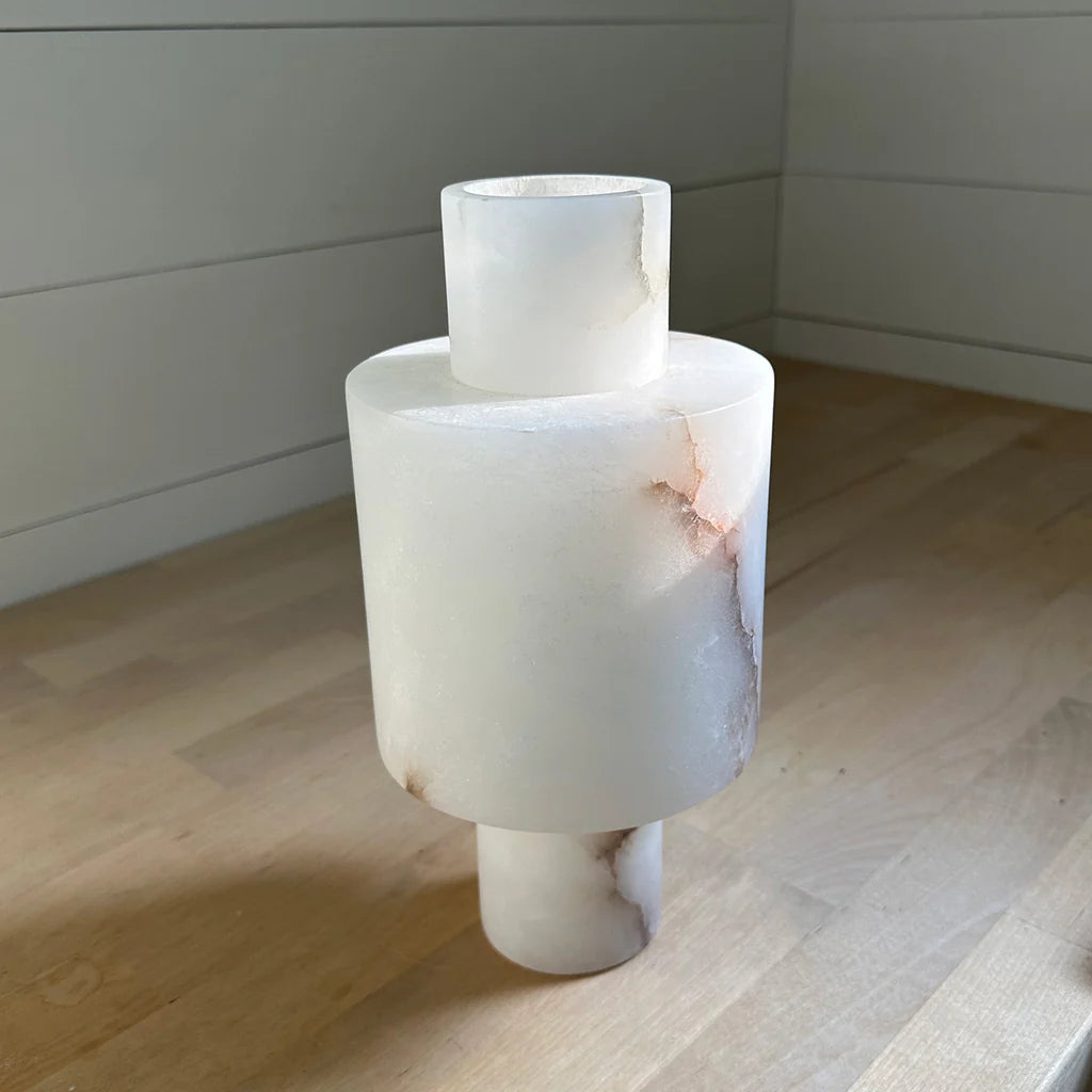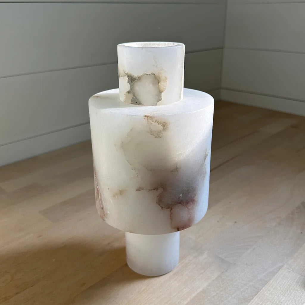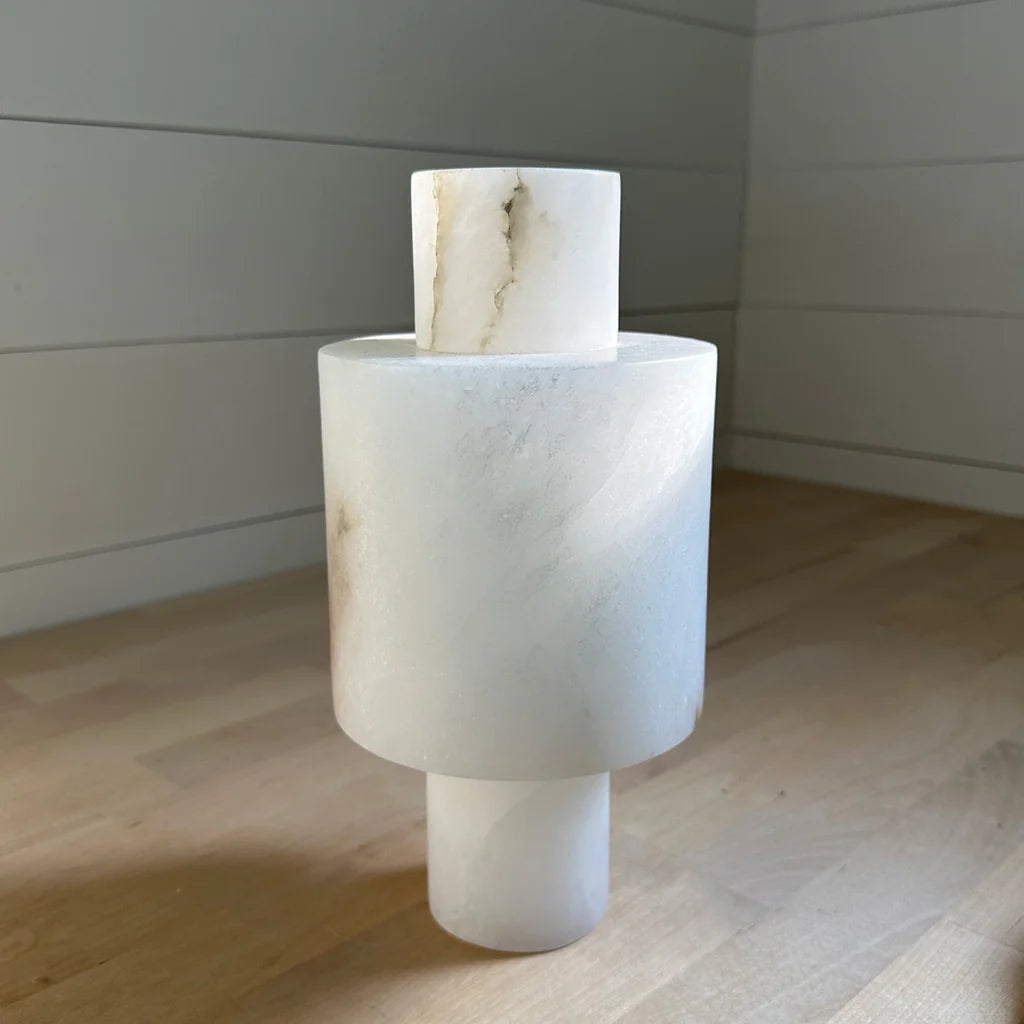 This is a one-of-a-kind vase that we named Maxine. Made out of beautiful alabaster and comes with a slim clear glass insert to guarantee that it will be water-tight and keep your stone clean. The photos show the exact piece for sale.