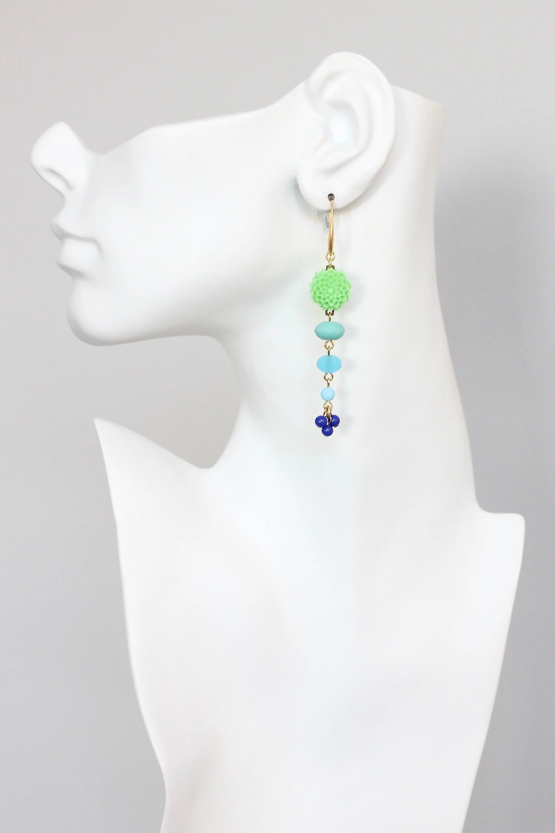 18k gold plated brass hooks with acrylic flower and glass beads. Each earring weighs .17 oz. and measures 3.25 inches in length from top to bottom.