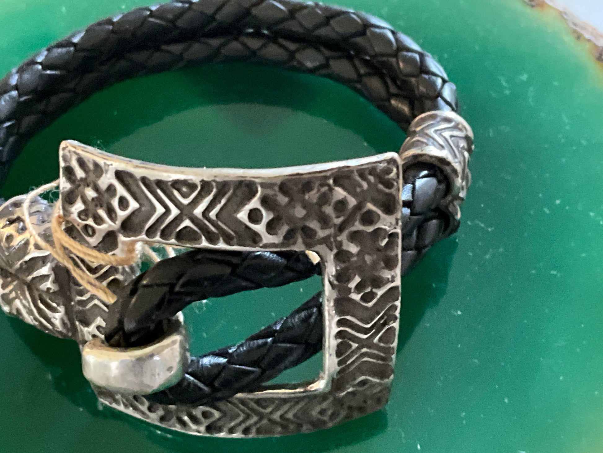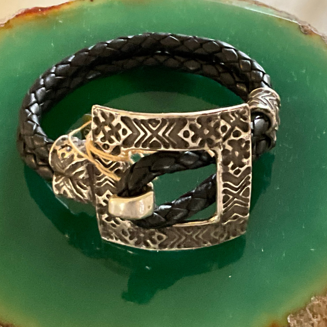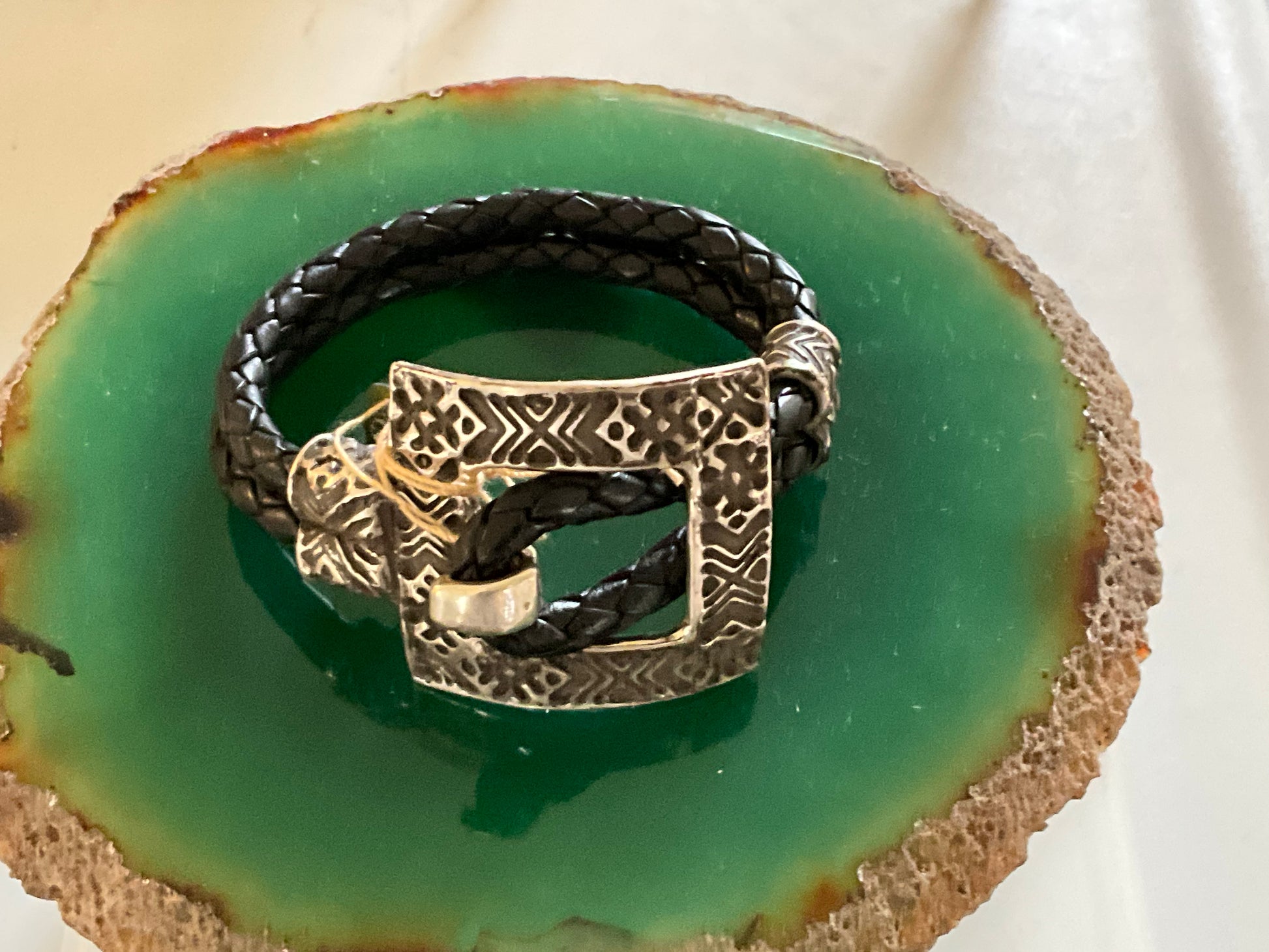 This handmade wrap bracelet is made of genuine braided leather and solid sterling silver, with a square Santa Fe inspired clasp.